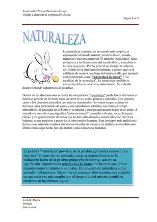 La naturaleza se refiere al mundo físico y a la vida en general, incluyendo plantas, animales y procesos asociados con objetos inanimados. Generalmente no incluye objetos artificiales ni intervención humana. La naturaleza se extiende desde el mundo subatómico hasta el galáctico. La palabra naturaleza proviene del latín y significa originalmente la forma innata en que crecen espontáneamente las plantas y animales.