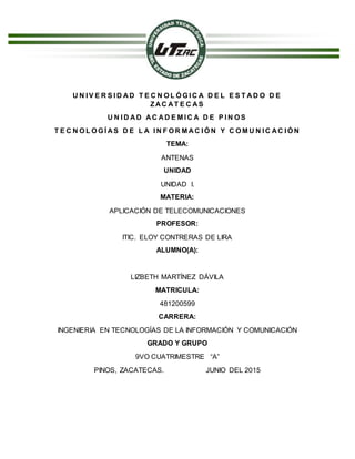 Este documento presenta información sobre antenas. Explica que una antena es un dispositivo conductor diseñado para emitir u obtener ondas electromagnéticas. Detalla que el tamaño de una antena depende de la frecuencia de diseño, siendo mayor para frecuencias más altas. Describe tres tipos de antenas comunes: la dipolo, Yagi-Uda direccional y parabólica. También define conceptos clave como patrón de radiación, directividad, impedancia, ancho de banda y polarización.