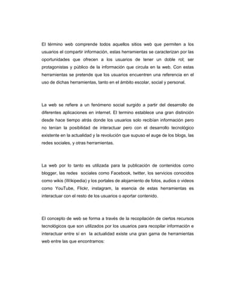 El documento describe las diversas herramientas de la web 2.0 como blogs, wikis, redes sociales y entornos de almacenamiento que permiten a los usuarios compartir y crear contenido de forma colaborativa. También clasifica las herramientas en repositorios para almacenar contenido, herramientas de producción para crear contenido y herramientas de integración para crear sitios web completos. El uso de estas herramientas en la educación permite atraer la atención de los estudiantes y fomentar el análisis y