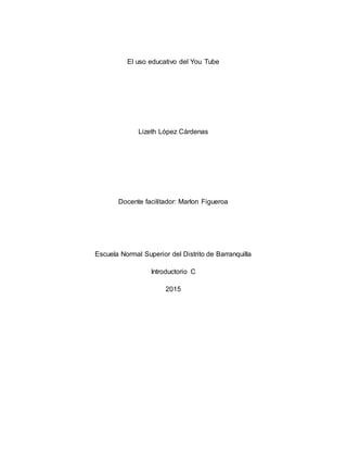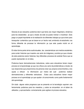 El documento describe el uso educativo de YouTube y cómo puede mejorar el aprendizaje de los estudiantes. Los videos en YouTube pueden motivar a los estudiantes y ayudarlos a procesar la información de manera diferente. Los videos también permiten contar historias y demostrar procesos físicos de una manera que ayuda a crear conocimiento. El uso educativo de videos tiene un mayor impacto en el aprendizaje ya que presenta problemas y situaciones que ayudan a los estudiantes a desarrollar sus propios conocimientos.
