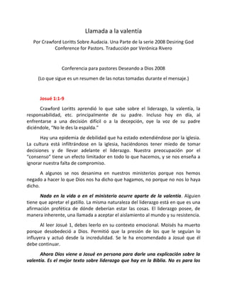 El documento habla sobre la valentía en el liderazgo cristiano. Argumenta que la valentía proviene de (1) un claro encargo de Dios, (2) la afirmación de la presencia de Dios, y (3) una determinación concreta para obedecer a Dios. También señala que la valentía se sostiene mediante (4) una relación íntima con la Palabra de Dios a través de la proclamación, meditación y obediencia de lo que dice. El documento exhorta a los líderes cristianos