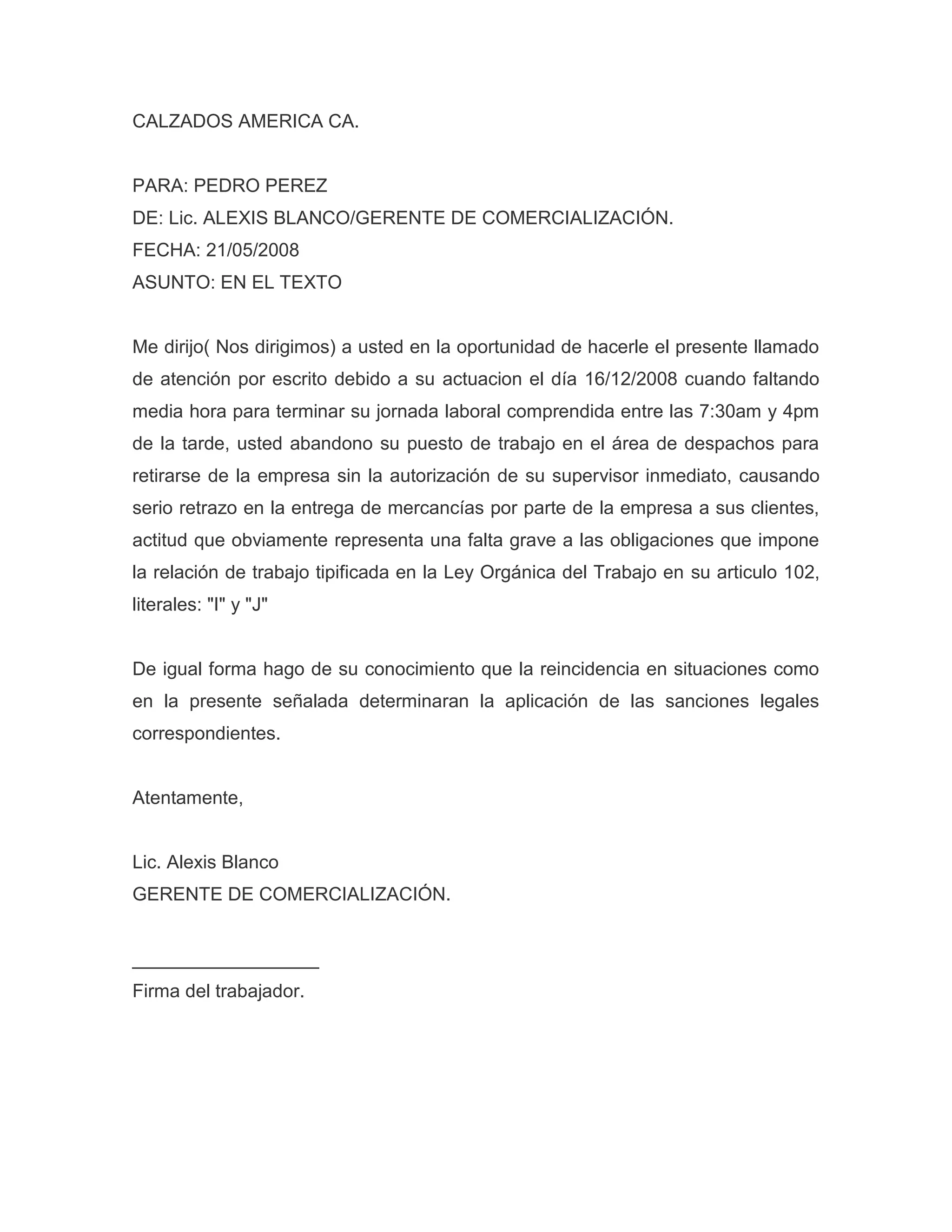 El gerente de comercialización de Calzados América CA escribe una carta de llamado de atención a Pedro Pérez por abandonar su puesto de trabajo media hora antes de terminar su jornada laboral sin autorización, causando retrasos en la entrega de mercancías a los clientes. El gerente indica que esta acción representa una falta grave a las obligaciones laborales según la ley y que la reincidencia resultará en sanciones legales.