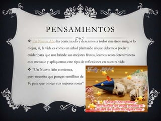 El documento habla sobre las tradiciones y reflexiones de fin de año. Señala que quemar el monigote o "año viejo" representa dejar atrás las experiencias negativas del año pasado e iniciar uno nuevo con esperanza. Además, menciona que la tradición de quemar figuras para el fin de año se remonta a culturas antiguas como la babilónica, griega y romana, la cual rendía culto a Prometeo incinerando figuras que representaban los vicios humanos.