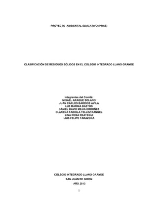 Este proyecto busca promover hábitos de clasificación de residuos sólidos en el Colegio Integrado Llano Grande a través de estrategias pedagógicas. Se organizarán grupos ecológicos por grado para clasificar los residuos generados en la institución. Además, se capacitará a la comunidad educativa con el apoyo de la Corporación para la Defensa de la Meseta de Bucaramanga para llevar estos hábitos a los hogares. El proyecto se desarrollará de manera interdisciplinaria para cre