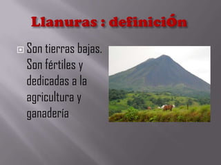 Este documento resume las características de la Zona Norte de Costa Rica. Se localiza al este de la Cordillera de Guanacaste y al norte de la Volcánica Central e incluye lugares como Guatuso, Upala y Los Chiles. Es una región de tierras bajas fértiles dedicadas a la agricultura y ganadería, con bosques húmedos y llanuras que permiten cultivos de frijoles, bananos, plátanos, maíz y frutas.