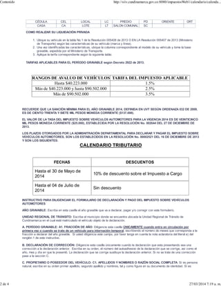 El documento proporciona instrucciones para diligenciar el formulario único del impuesto sobre vehículos automotores en Cundinamarca, Colombia. Explica cómo declarar y pagar el impuesto incluyendo detalles sobre avalúos vehiculares, tarifas aplicables, descuentos disponibles y fechas límite. También advierte sobre posibles sanciones por declaraciones tardías o incorrectas.