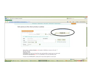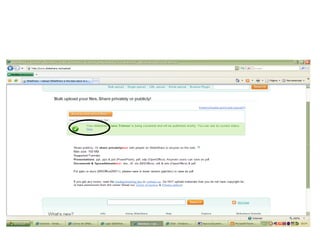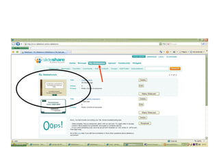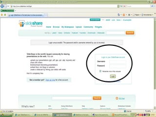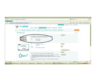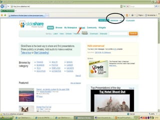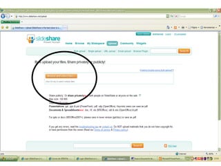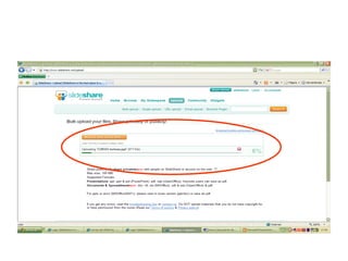Slideshare permite subir presentaciones de PowerPoint y obtener un enlace para publicarlas en un blog. El documento explica que se debe copiar la dirección URL de la presentación en Slideshare y pegarla directamente en una nueva entrada del blog para publicarla.