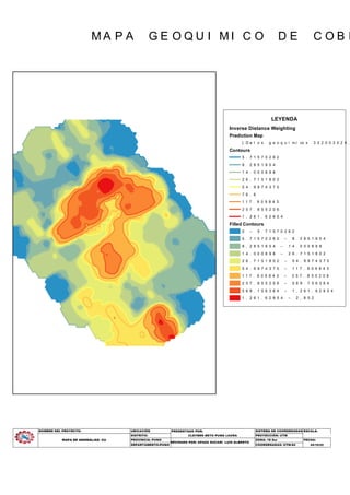 Este documento presenta dos mapas geoquímicos de oro y cobre de un proyecto minero. El primer mapa muestra las anomalías de oro en la zona con valores entre 0.004 y 0.344 partes por millón. El segundo mapa presenta las concentraciones de cobre, con valores entre 5.7 y 2,802 partes por millón. Ambos mapas fueron revisados por Apaza Sucari Luis Alberto y presentados por Puma Laura como parte de un proyecto minero en el distrito de Cleyber, provincia de Puno, departamento de P
