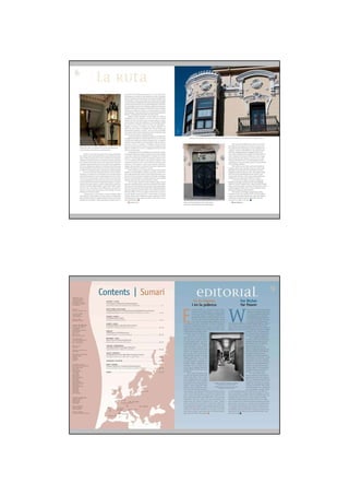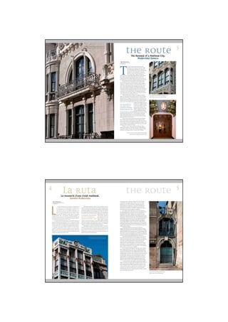 El documento describe las rutas y publicaciones relacionadas con el paisaje urbano de Barcelona. Se detalla la Ruta del Modernismo de Barcelona, que incluye visitas guiadas a importantes monumentos modernistas como la Sagrada Familia, Casa Batlló y Parque Güell. También se mencionan las rutas europeas del modernismo y art nouveau que buscan promover el patrimonio arquitectónico de esta época en distintas ciudades.