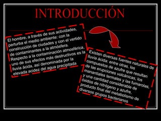 Conocer los efectos negativos de la lluvia ácida en el ambiente como el agua, suelo, fauna y flora. Plantear soluciones para minorar la acidificación de las aguas e identificar los principales productores de las lluvias ácidas. Aprender que la educación ambiental juega un papel importante en cuanto al comportamiento humano frente al medio ambiente y la vital importancia que éste tiene para nuestra supervivencia.