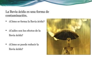 La lluvia ácida se forma cuando los óxidos de azufre y nitrógeno emitidos por combustión reaccionan con el agua en la atmósfera, formando ácidos que caen en la lluvia. Esto daña los bosques al descomponer los nutrientes del suelo y libera metales tóxicos en ecosistemas acuáticos y terrestres. Para reducir la lluvia ácida se debe disminuir la emisión de compuestos como el azufre en combustibles mediante su eliminación o captura antes de ser emitidos.