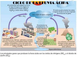 La lluvia ácida se produce cuando los gases contaminantes como el dióxido de azufre y el óxido de nitrógeno de las fábricas y vehículos se mezclan con las gotas de agua en las nubes, formando ácidos sulfúrico y nítrico. Estos ácidos dañan los ecosistemas acuáticos y terrestres, las plantas, los humanos y los edificios. Algunas soluciones incluyen reducir las emisiones de azufre en combustibles, usar más gas natural e instalar equipos