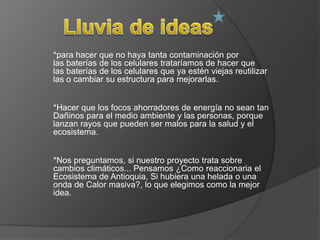 El documento propone tres formas de hacer que la tecnología sea más sostenible y respetuosa con el medio ambiente. Primero, reutilizar o mejorar las baterías de celulares usadas para reducir la contaminación. Segundo, hacer que los focos ahorradores de energía sean menos dañinos para la salud y el ecosistema. Tercero, el documento considera estudiar cómo reaccionaría el ecosistema de Antioquia ante cambios climáticos extremos como heladas o olas de calor masivas.