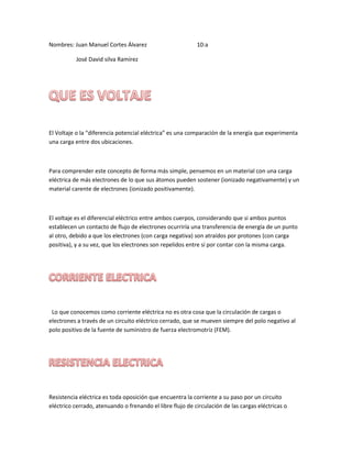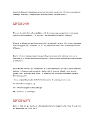 El voltaje es la diferencia de energía eléctrica entre dos puntos, como entre un material con exceso de electrones y uno con déficit. La corriente eléctrica es el flujo de electrones a través de un circuito cerrado impulsado por una fuente de energía. La ley de Ohm establece que la intensidad de corriente es directamente proporcional al voltaje e inversamente proporcional a la resistencia del material.