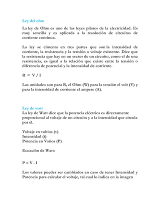 Este documento resume conceptos básicos de electricidad como voltaje, corriente eléctrica, resistencia eléctrica, la ley de Ohm, la ley de Watt, potencia eléctrica e impedancia. Explica que el voltaje mide la diferencia de potencial eléctrico, la corriente eléctrica es el flujo de carga eléctrica, y la resistencia se refiere a la oposición de los materiales al paso de corriente. También resume las leyes de Ohm y Watt que relacionan voltaje, cor