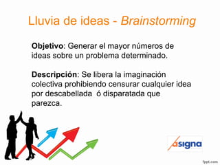 Este documento describe la técnica de lluvia de ideas o brainstorming, que tiene como objetivo generar el mayor número de ideas sobre un problema determinado mediante la liberación de la imaginación colectiva. Las características clave son que es una herramienta poderosa para la resolución de problemas que se emplea en grupo y puede usarse para cualquier tipo de problema. Existen diferentes tipos como brainstorming en equipos por escrito, individual o en panel.