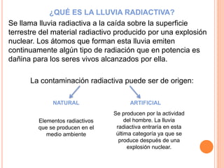 La lluvia radiactiva se produce cuando material radiactivo liberado en una explosión nuclear cae en forma de lluvia sobre la superficie terrestre. Puede ser lluvia radiactiva local cerca de la explosión o lluvia radiactiva global que transportan partículas radiactivas a la estratosfera y pueden alcanzar todo el mundo. Las principales causas de contaminación radiactiva que producen lluvia radiactiva son las actividades industriales como la producción de energía nuclear.