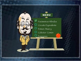 El documento resume los parámetros híbridos y sus circuitos equivalentes para modelar transistores bipolares. Explica que los parámetros híbridos engloban parámetros de impedancia y admitancia para caracterizar el comportamiento lineal de pequeña señal de un transistor. Presenta las ecuaciones de parámetros híbridos y los circuitos equivalentes para las configuraciones emisor común, base común y colector común.