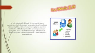 El documento describe la evolución de la web a través de las eras Web 1.0, 2.0 y 3.0. La Web 1.0 consistía principalmente en páginas web estáticas con contenido de solo texto. La Web 2.0 introdujo blogs, wikis, foros y redes sociales que permitieron la colaboración y compartición de contenido entre usuarios. La Web 3.0 representa la web semántica, basada en la nube y accesible desde múltiples dispositivos, que ofrece servicios inteligentes a los usuarios aprovechando la nube