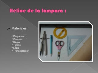 El documento proporciona instrucciones para construir una lámpara de hélice. Explica cómo hacer una hélice de papel y pestañas, una pantalla de cartulina decorada con papel celofán, y un soporte de madera. Luego describe ensamblar los componentes pegando las pestañas en ranuras y amarrando la hélice al soporte, con una vela debajo para iluminación.