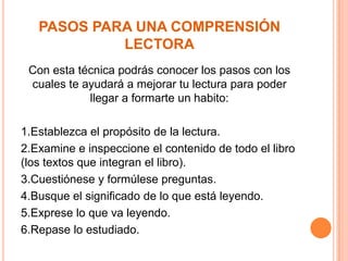 Este documento presenta un nuevo método de estudio que incluye seis pasos: 1) establecer el propósito de la lectura, 2) examinar el contenido del libro, 3) hacer preguntas, 4) buscar el significado, 5) expresar lo leído, y 6) repasar. También describe diferentes sistemas de representación como visual, auditivo y kinestésico, y recomienda crear tarjetas didácticas para facilitar el aprendizaje.