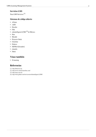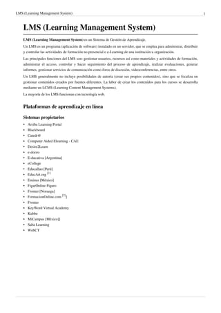 Un LMS (Sistema de Gestión de Aprendizaje) es un programa de software instalado en un servidor que permite administrar, distribuir y controlar actividades de formación a distancia de una institución. Un LMS gestiona usuarios, recursos, materiales y evaluaciones, y genera informes. Existen LMS propietarios y de código abierto, y su función principal es gestionar contenidos creados externamente más que crearlos.