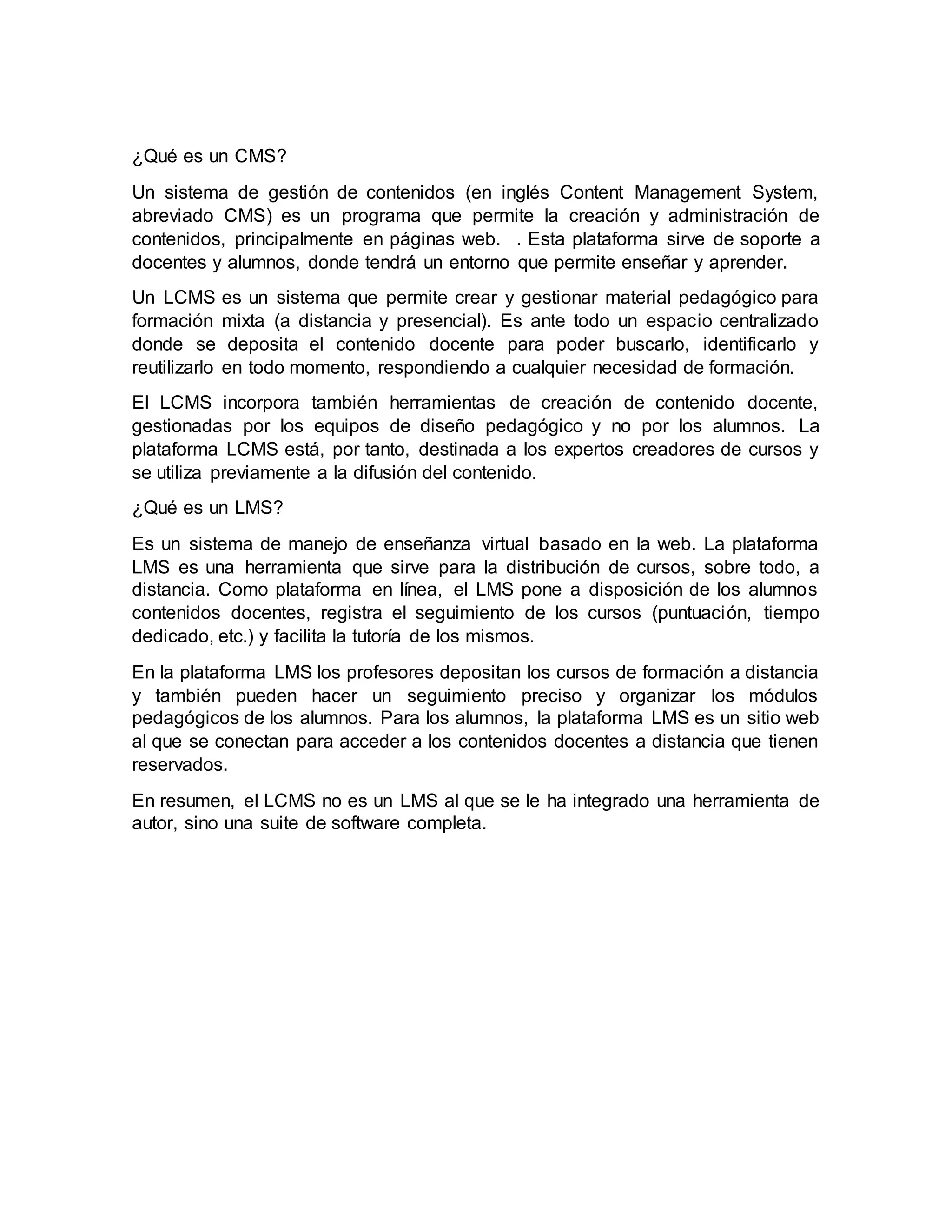 Un CMS es un programa que permite la creación y administración de contenidos en páginas web. Un LCMS es un sistema que permite crear y gestionar material pedagógico para formación mixta de manera centralizada, mientras que un LMS es una plataforma en línea para distribuir cursos a distancia y hacer un seguimiento de los alumnos. A diferencia de un LMS, un LCMS está destinado a expertos creadores de cursos y no a los alumnos.