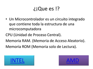 El documento presenta la evolución de los procesadores de Intel y AMD desde 1971 hasta la actualidad. Detalla los principales procesadores lanzados por cada compañía cronológicamente y sus características clave como la capacidad de memoria, velocidad y mejoras en rendimiento y funciones.