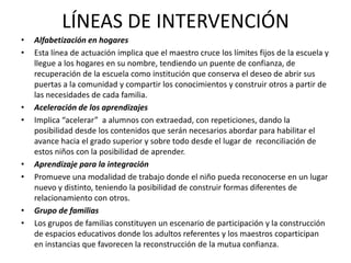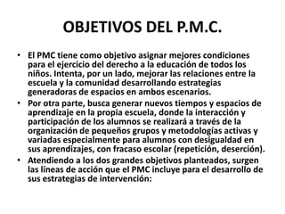 El PMC tiene como objetivos asignar mejores condiciones para el derecho a la educación de todos los niños y generar nuevos tiempos y espacios de aprendizaje en la escuela a través de la organización de pequeños grupos y metodologías activas. Para lograr estos objetivos, el PMC incluye líneas de acción como la alfabetización en hogares, la aceleración de los aprendizajes, el aprendizaje para la integración y los grupos de familias.