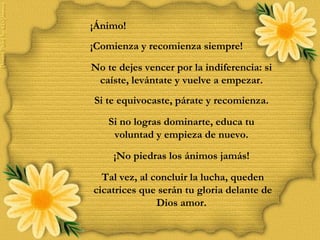 El documento anima a las personas a no rendirse ante la indiferencia y a levantarse si caen, a corregir sus errores y volver a empezar si se equivocan, y a educar su voluntad para seguir adelante si no logran dominarse. Aunque la lucha deje cicatrices, estas serán su gloria ante Dios.