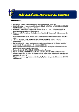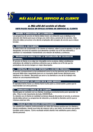 Este documento describe cuatro pasos esenciales para establecer un efectivo sistema de servicio al cliente: 1) comprometer la dirección, 2) conocer a los clientes, 3) desarrollar estándares de calidad, y 4) contratar, capacitar y recompensar al personal adecuado. Además, enfatiza la importancia de permanecer cerca de los clientes y mejorar continuamente.