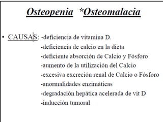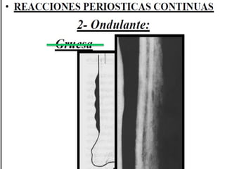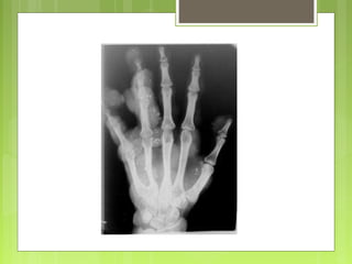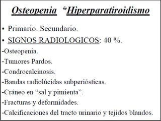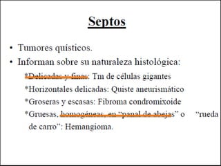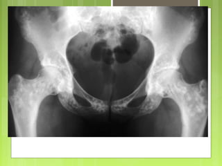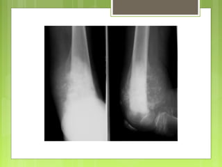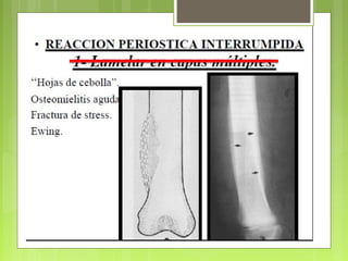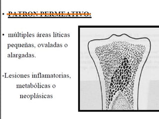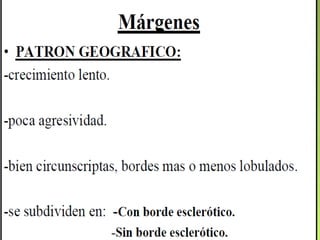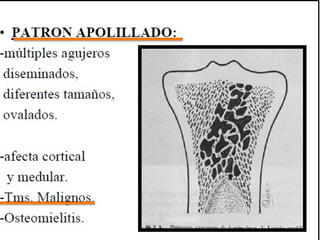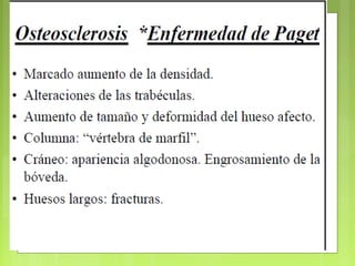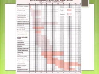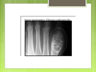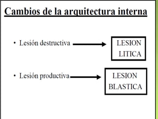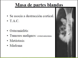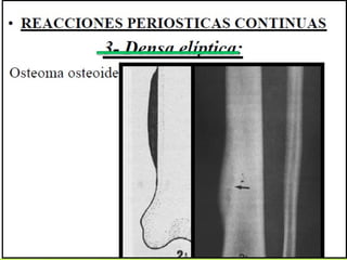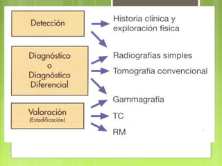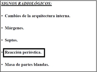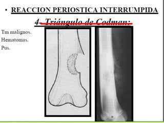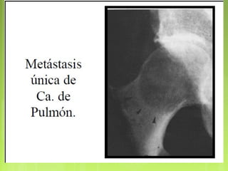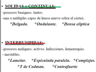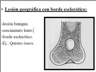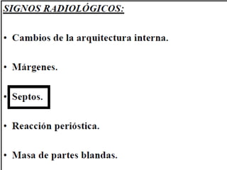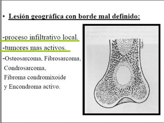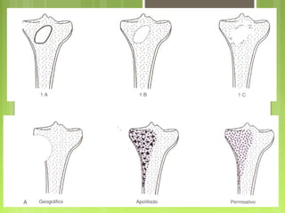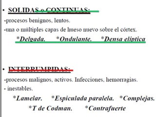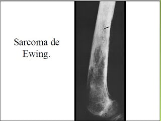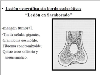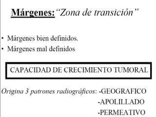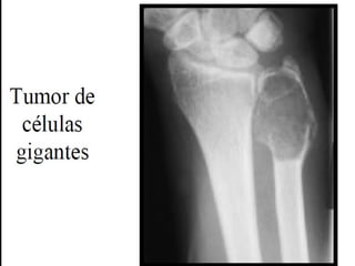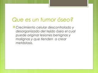 Este documento describe diferentes tipos de tumores óseos. Explica que un tumor óseo es un crecimiento celular descontrolado en el tejido óseo que puede ser benigno o maligno. Describe varios tumores óseos comunes incluyendo osteoma, osteoma osteoide, osteocondroma, condroma, condroblastoma y tumor de células gigantes, y proporciona detalles sobre sus características clínicas y radiológicas. El documento también cubre temas como la histología, clasificación, diagnóstico y tratamiento de