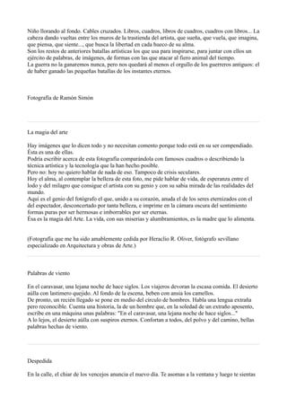 Este documento presenta varios relatos cortos y poemas sobre temas como la vida, el arte, la muerte y las tradiciones de Sevilla. Describe escenas como un artista en su estudio lleno de libros y cuadros, una procesión religiosa bajo la lluvia, y recuerdos de una anciana que se muda de su casa.