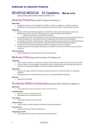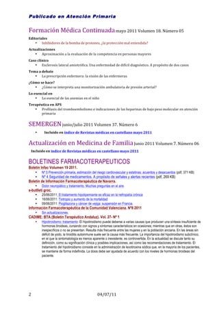Este documento proporciona un resumen de varias revistas médicas en español, incluyendo Atención Primaria, Medicina Clínica, Formación Médica Continuada y SEMERGEN. Se destacan artículos y editoriales sobre temas como adherencia terapéutica, hipertensión, cáncer cutáneo, diabetes, osteoporosis, entre otros. También incluye resúmenes de boletines farmacoterapéuticos sobre prevención cardiovascular, seguridad de medicamentos y tratamiento del dolor neuropático.
