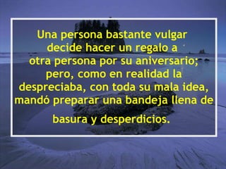 Una persona envió un regalo de basura a otra persona por su aniversario para humillarlo públicamente. Sin embargo, el agasajado recibió el regalo con alegría, limpió la bandeja y la cubrió de flores antes de devolverla con una nota que decía "Cada uno da lo que posee". El mensaje enseña a no enojarse con otros y a regalar las flores de tu corazón.