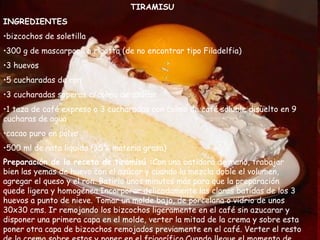 El documento presenta recetas de varios postres tradicionales como tiramisú, tres leches, mousse de chocolate, arequipe, dulce de naranja y bomba de chocolate. Incluye lista de ingredientes y pasos para preparar cada uno, destacando el tiramisú hecho con mascarpone, huevos, café y cacao; el postre de tres leches con bizcocho, leches condensada, evaporada y entera; y la bomba de chocolate rellena de helado de vainilla y sorbete de naranja cubierta con merengue.