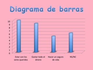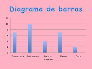 Este documento presenta los resultados de dos encuestas realizadas. La primera encuesta pregunta qué haría una persona si quedara embarazada no deseada, mostrando los resultados en una tabla y gráfico de sectores. La segunda encuesta pregunta cómo pasaría una persona sus últimas 24 horas de vida, también presentando los resultados en una tabla y gráfico de sectores. El documento introduce brevemente conceptos básicos de estadística.