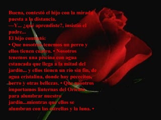 El hijo de un padre adinerado pasó unos días viviendo con una familia campesina para aprender qué significa ser pobre. Al regresar, el hijo le explicó a su padre las lecciones aprendidas, como que la familia campesina tiene más espacio y belleza natural, cultiva su propia comida, y vive conectada a la vida y la naturaleza en lugar de a la tecnología. El padre quedó impactado por la profundidad de pensamiento de su hijo, quien concluyó que a pesar de sus posesiones materiales, ellos