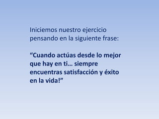Este documento presenta un test de 15 preguntas para evaluar cómo una persona actúa frente a la vida y los desafíos. Luego analiza los resultados posibles del test y comparte citas y reflexiones sobre aceptar la responsabilidad personal, aprender de los errores, enfocarse en el trabajo en lugar de los problemas, y despertar el potencial interior para triunfar en la vida. El objetivo es motivar a las personas a actuar desde lo mejor de sí mismos y asumir el control sobre su destino.
