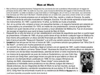 El documento proporciona información sobre la banda australiana de rock Men at Work. La banda se formó en 1978 en Melbourne y alcanzó el éxito internacional en la década de 1980 con canciones como "Who Can It Be Now?" y "Down Under". La banda se separó en los años 90 aunque algunos de sus miembros se han reunido ocasionalmente para conciertos.