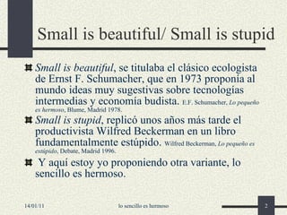 El documento argumenta que, dado el aumento de la complejidad en las sociedades industriales y las limitaciones inherentes de nuestra capacidad para gestionarla, es urgente considerar la sencillez como una alternativa viable. A través de ejemplos como el caso Madoff y la marea negra de BP, se ilustra cómo la complejidad puede llevar a catástrofes inevitables debido al mal manejo y la falta de comprensión. La reflexión se centra en la necesidad de reevaluar nuestra dependencia de tecnologías complejas que, a menudo, superan nuestra capacidad de control y entendimiento.
