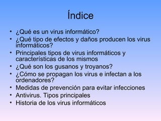 Este documento trata sobre virus informáticos. Explica que un virus es un programa dañino que puede reducir la velocidad del ordenador u ocasionar daños como la pérdida de archivos. Describe los principales tipos de virus como gusanos y troyanos, y cómo se propagan e infectan otros ordenadores. También detalla medidas de prevención como usar antivirus e instalar actualizaciones, y la historia de los primeros virus informáticos.