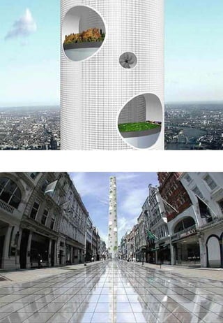 El documento presenta una variedad de nuevos diseños y productos tecnológicos como edificios inteligentes en Corea, pantallas curvas, flexibles y plegables para computadoras, teléfonos y televisores, así como innovaciones en electrodomésticos, muebles, iluminación y transporte, entre otros.
