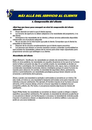 Este documento describe la importancia de comprender las necesidades del cliente. Para lograr una comprensión adecuada del cliente, es necesario prestar atención a lo que el cliente expresa, anticiparse a sus necesidades y ofrecer servicios adicionales relacionados. Las necesidades de los clientes pueden ser funcionales o psicológicas, y cuando se estimulan se convierten en motivos que impulsan al cliente a buscar satisfacción.