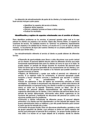 Este documento describe la importancia de construir relaciones con los clientes a través de la escucha activa y la retroalimentación. Se enfatiza la necesidad de hacer preguntas abiertas, escuchar atentamente las preocupaciones de los clientes, y obtener retroalimentación a través de discusiones, quejas, sugerencias y entrevistas para mejorar continuamente el servicio.