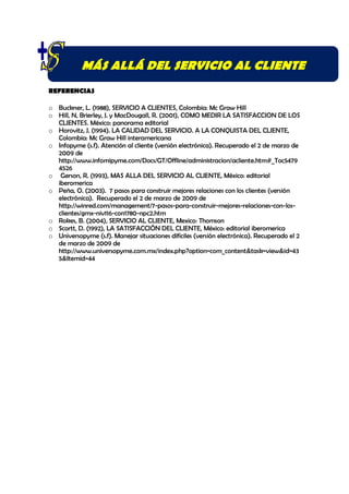 Este documento presenta los 7 pasos hacia un eficaz sistema de servicio al cliente, incluyendo el compromiso de la dirección, conocer a los clientes, desarrollar normas de calidad, contratar y capacitar al personal, recompensar logros en el servicio, mantenerse cerca de los clientes, y trabajar para mejorar continuamente.