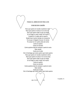 El documento trata sobre una loba que sale de caza en busca de aventuras amorosas una noche de luna llena, describiendo su personalidad juguetona, libre y seductora. También incluye una canción de desamor donde una persona expresa su tristeza por una ruptura a través de la metáfora de unos ojos azules que no dejan de llorar, así como una canción de amor dedicada a un tal Luis donde se declara el profundo amor y añoranza que siente por él.