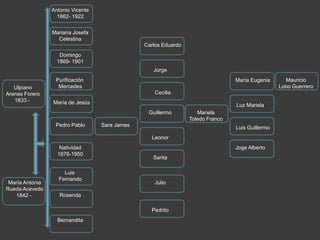 Este documento presenta un álbum de fotos de la familia Lobo-guerrero Arenas. Incluye las fechas de nacimiento y muerte de varios miembros de la familia desde 1833 hasta 2010. El documento fue creado para una reunión familiar en julio de 2010 en Socorro, Zapatoca, Colombia para conmemorar los 96 años como obispo de Antonio Vicente Arenas Rueda.