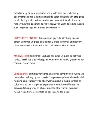 Este documento describe 4 experimentos químicos realizados en un laboratorio. El primero observa cómo el color de la llama cambia al agregar ácido bórico, el segundo cómo el alcohol puede cocinar un huevo sin fuego, el tercero cómo un huevo flota en agua con sal, y el cuarto cómo hacer tinta invisible con limón. Los estudiantes aprenden sobre los cambios en las materias y sus propiedades a través de estos experimentos prácticos.