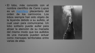 El lobo es un mamífero carnívoro que vive en manadas y se comunica a través de aullidos. Habita en Europa, Asia, África y América. Se alimenta de pequeños y medianos mamíferos, insectos, fruta e incluso pescado. Sus características incluyen un pelaje grueso, colmillos de hasta 6 cm y una cola que usa para transmitir emociones.